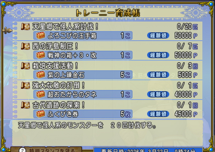 ・栽培支援活動! 紫の上錬金石 × 5 こ 5000 P 0 / 3 回