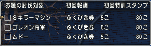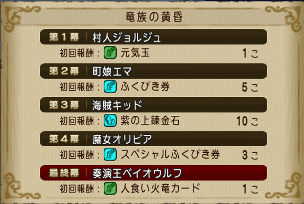せかいじゅの葉3、ふくびき券5、紫の上錬金石10、せかいじゅのしずく1、人食い火竜カード