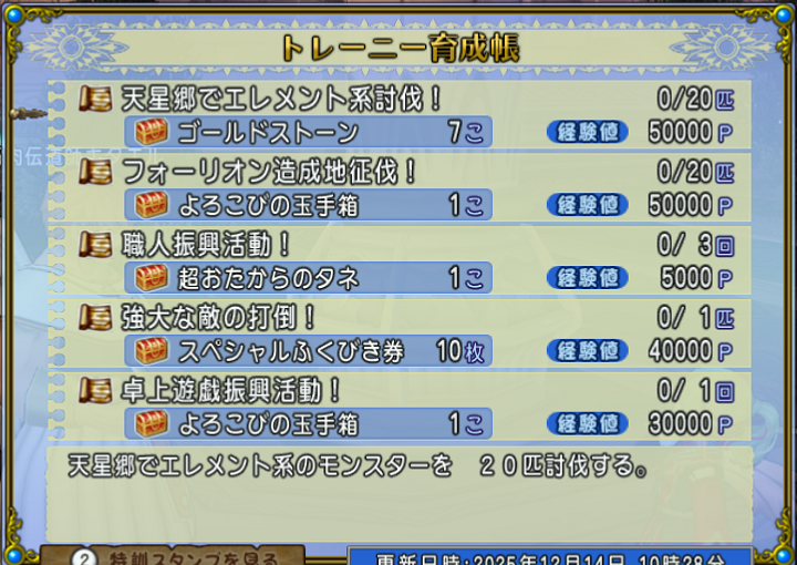 ・天星郷でエレメント系のモンスターを 20匹討伐する。
