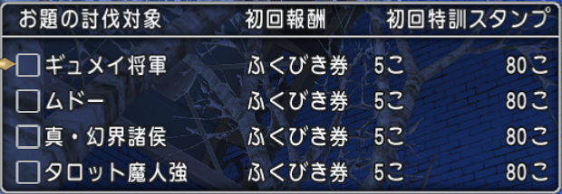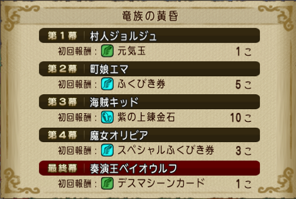 ・「竜族の黄昏」せかいじゅの葉3、ふくびき券5、紫の上錬金石10、せかいじゅのしずく1、デスマシーンカード