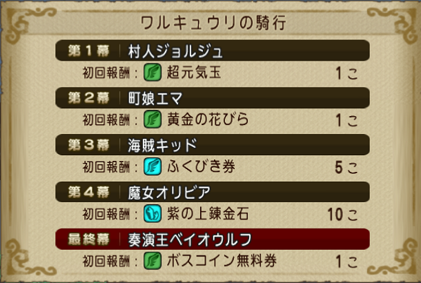 ・「ワルキュウリの騎行」超元気玉1、黄金の花びら1、ふくびき券5、紫の上錬金石10、ボスコイン無料券