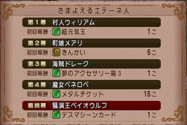 ・「さまよえるエテーネ人」超元気玉、きんかい5、夢のアクセサリー箱3、メタルチケット15、デスマシーンカード